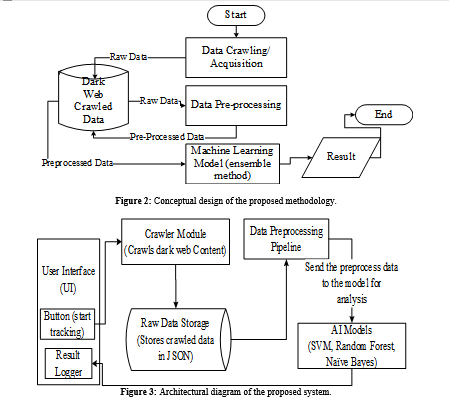 The Dark Web is a hidden part of the internet that attracts perpetrators due to its anonymity. It is used for cybercrime, illegal trading, and by terrorist groups to exchange stolen data and personal information. Current techniques for combating and identifying these concerns are weak. The primary focus of this study is on the application of artificial intelligence to monitor the Dark Web. The solution mitigates monitoring deficiencies to facilitate the timely identification of prospective threats, including data breaches and cybercrimes. The six forms of activities prioritised include cyberterrorism, terrorist activities, weapons trading, drug trafficking, human trafficking, and regular activities. The tasks carried out in this study include crawling relevant data, training machine learning models using an ensemble voting approach, and implementing a JavaScript-powered crawling engine. The AI model is tested and evaluated using data collected from various Onion sites that include both legal and illegal content. The approach used in this study gives 97% accuracy and a macro average precision of 98%. The macro average for recall and f1-score is 97%. The precision, recall and F1-Score all have the same weighted average of 97%.